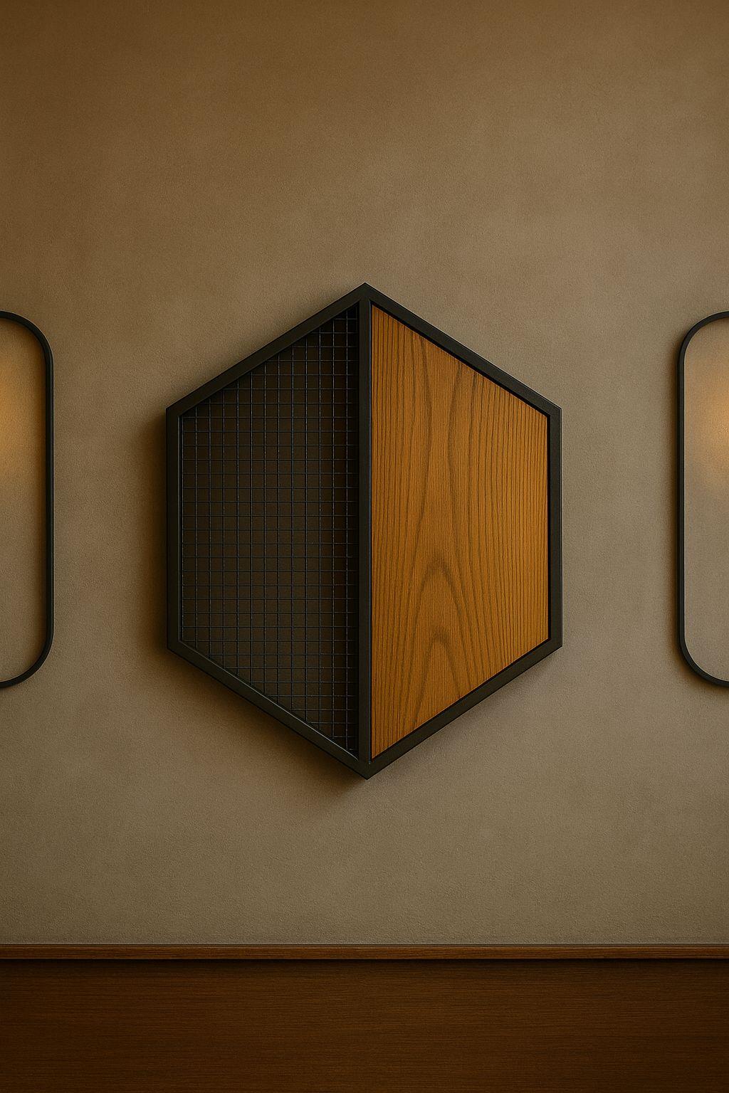 • 50/50 kontrast: metal mesh & doğal ahşap