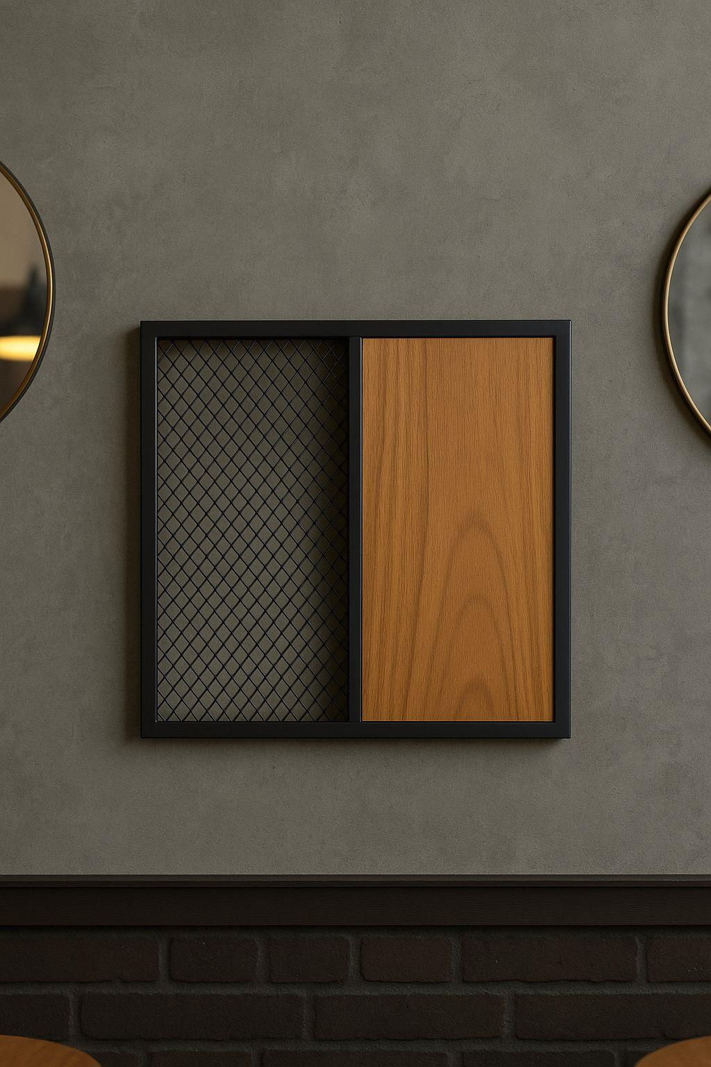 •    50/50 kontrast: metal mesh & doğal ahşap