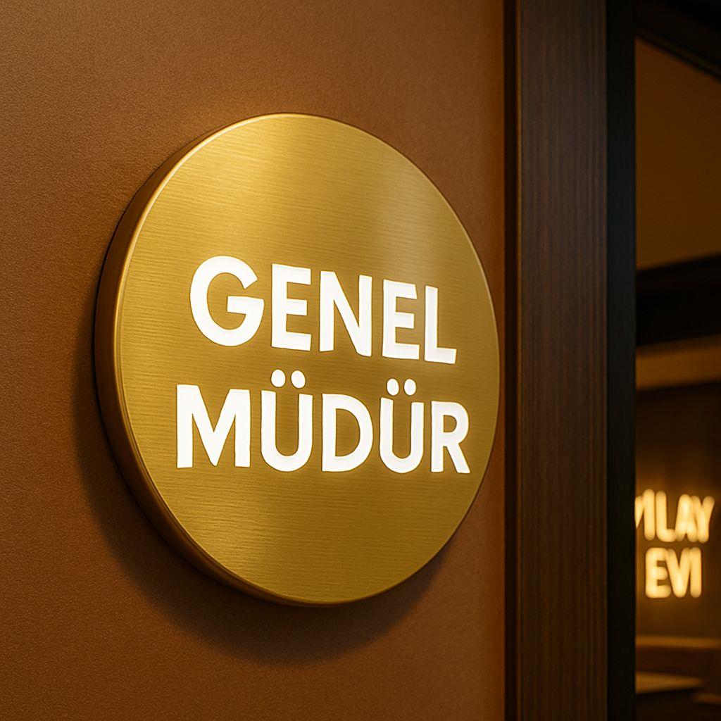Teknik Özellikler •Malzeme: 8mm Pvc üzerine 1mm gold paslanmaz, üzerine beyaz folyo kesim •Tasarım: Yuvarlak form. Arkasındaki 8mm Pvc sayesinde duvara tam yapışmaz 8mm havada durur ve daha şık bir görüntü sağlar. •Yazı Uygulaması: UV baskı veya folyo kesim harf seçeneği •Boyutlar: 17cm Çap •Montaj: Çift taraflı bant ve silikon ile kolay montaj •Kullanım Alanı: Ofis kapıları, toplantı odaları, otel odaları, yönlendirme tabelaları •Dayanıklılık: Çizilmeye ve darbelere karşı dirençli, uzun ömürlü kullanım •Bakım: Nemli bez ile kolayca temizlenebilir, deterjan ve kimyasal kullanılmaz